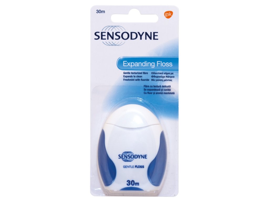 - Ața dentară SenSodyne se umflă doar cu umiditatea din gură, mărindu-i volumul și permițând astfel o curățare mai bună a spațiilor interdentare mai largi sau a zonelor din apropierea gâtului dinților.