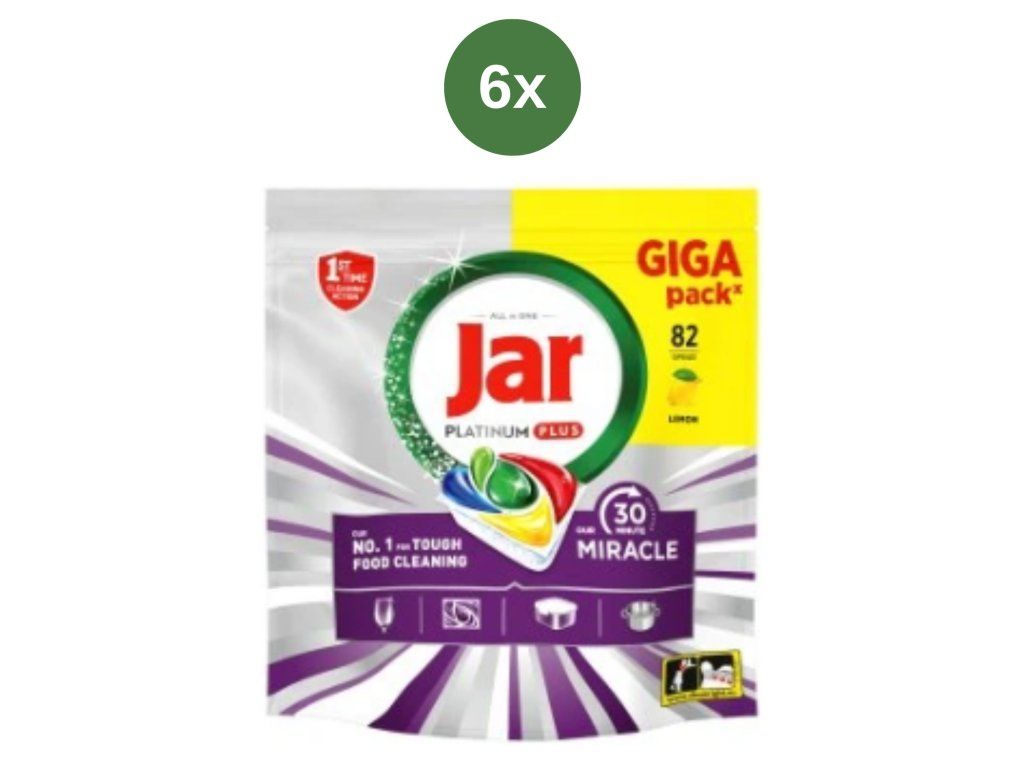 Capsulele de înaltă eficiență pentru mașina de spălat vase Jar Platinum Plus Miracle GIGA sunt o soluție all-in-one pentru vase perfect curățate fără efort. Sunt concepute pentru utilizare zilnică și chiar pentru vase foarte murdare cu reziduuri alimentare uscate.