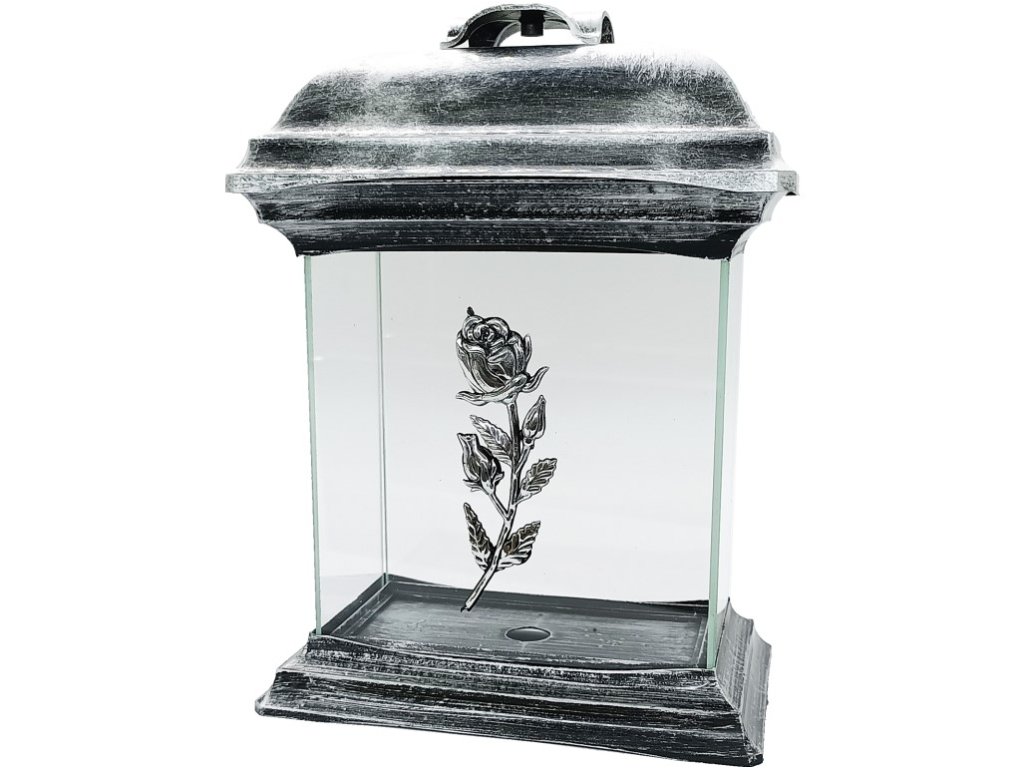 Felinar de cimitir elegant și stilat, Madonna, cu înălțimea de 26 cm, în formă de catedrală, cu motiv de trandafir argintiu. Acest design adaugă delicatețe și frumusețe discretă decorațiunii reverențioase. O alegere ideală pentru cei care doresc să încorporeze simbolismul trandafirului și eleganța argintie în decorațiunile lor. Lucrarea de înaltă calitate asigură o durată lungă de viață și un aspect demn.Parametri suplimentari
