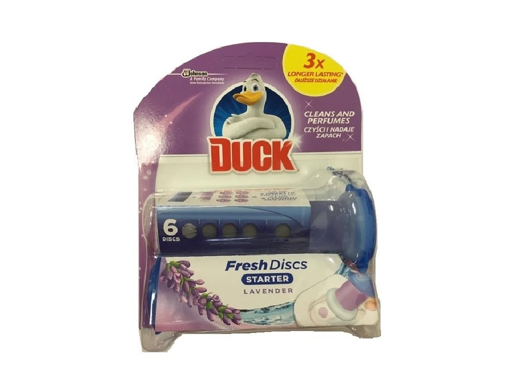 Gelul de toaletă Duck Fresh Discs Lavender curăță perfect toaleta și o protejează foarte fiabil de calcar . Pur și simplu aplicați pe peretele interior al vasului de toaletă, iar discul de gel Duck va face treaba pentru dvs. Gelul de toaletă Duck Fresh va parfuma întreaga cameră cu un parfum de lavandă . Rezerva Duck Fresh durează aproximativ 6 săptămâni sau până la 600 de spălări.