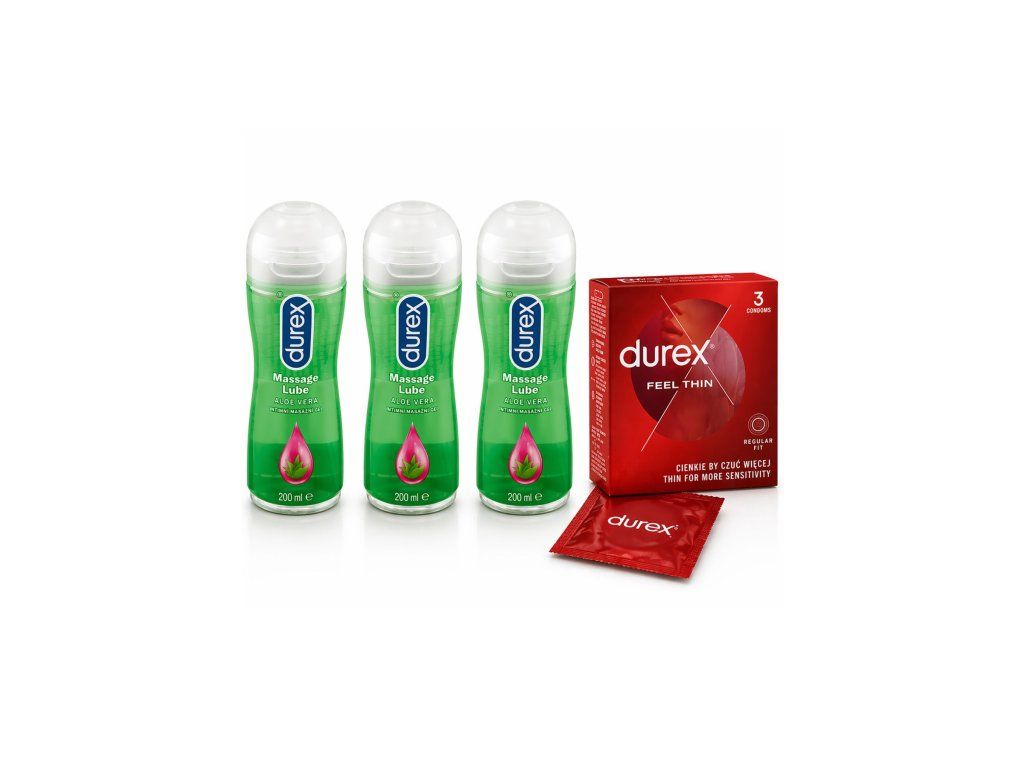 Lubrifiant Durex 3x200ml masaj 2 în 1 Aloe Vera + Prezervative Durex GRATUITE (3 buc/pachet)