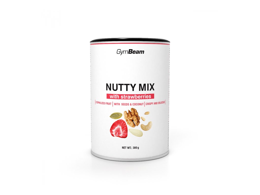 Nutty Mix cu căpșuni este un amestec delicios și crocant de nuci și semințe , îmbogățit cu căpșuni liofilizate . Fulgii de cocos adaugă o notă de exotism . Datorită proporției mari de migdale, caju și nuci, împreună cu semințe de dovleac și floarea-soarelui, acest amestec variat se mândrește cu un conținut de acizi grași nesaturați sănătoși . Aceștia pot contribui la menținerea unor niveluri optime de colesterol din sânge dacă acizii grași saturați sunt înlocuiți cu aceștia în dietă. Veți găsi și căpșuni aici . Acestea își păstrează culoarea și aroma distinctive datorită liofilizării (uscare prin congelare).