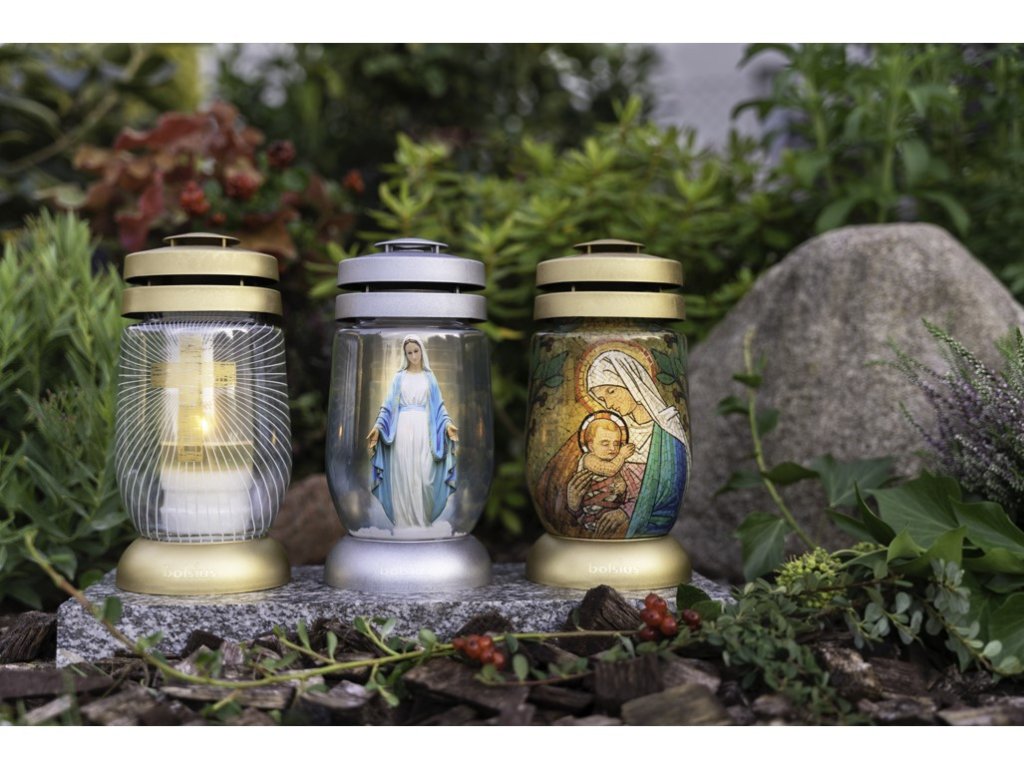 Această lumânare cu un mozaic al Mariei oferă un timp de ardere de 36 de ore și este ideală pentru ceremoniile religioase în cimitir. Dimensiunile sale sunt de 23 cm.Parametri suplimentari