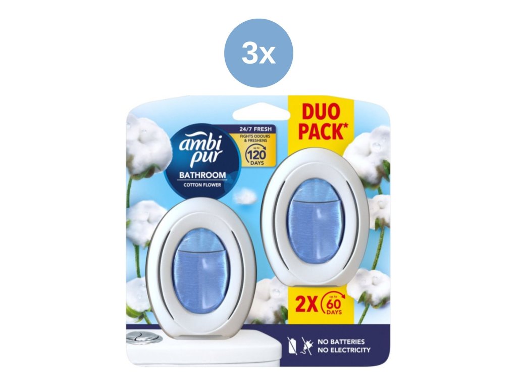 Odorizant de cameră Ambi Pur Cotton Fresh pentru baie, 3x2 buc/pachet.
