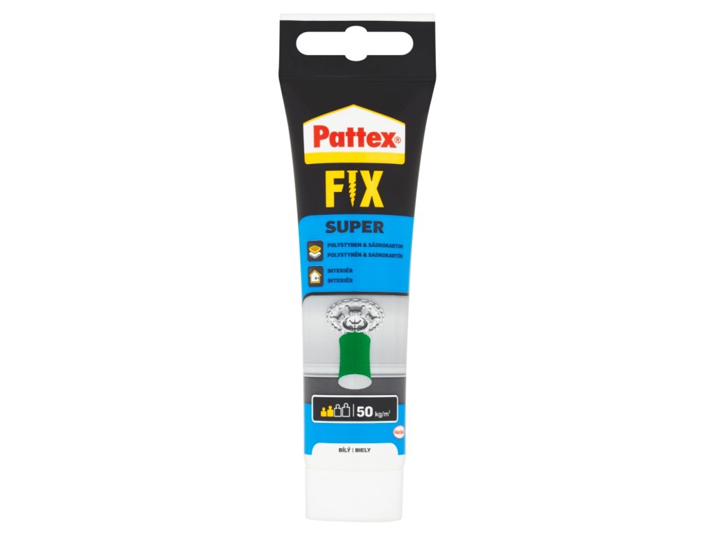 Pattex Super Fix Interior - tub de 50 g potrivit pentru: lipirea plăcilor și tocurilor de uși din lemn; ceramică, plăci ceramice, cărămizi, beton, plută, PVC, covoare, metal (protejat împotriva coroziunii), gips-carton; plăci și elemente decorative din polistiren, spumă poliuretanică rigidă și ipsos; adeziv fonoabsorbant.