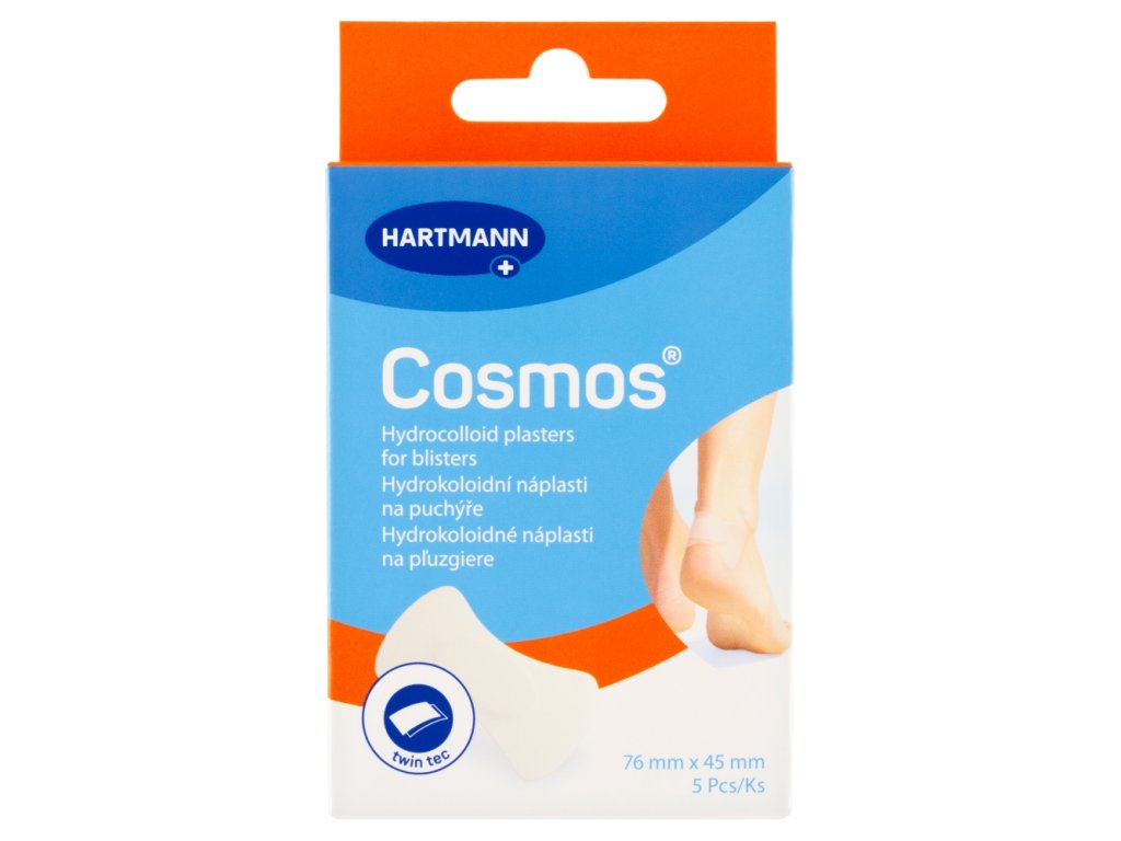 Plasturele hidrocoloid Cosmos pentru bășici, cu două straturi de hidrocoloizi, dublează protecția bășicii împotriva presiunii și frecării neplăcute și ameliorează eficient durerea. Plasturele hidrocoloid vindecător creează un gel umed pe bășică, în care bășica se vindecă mai repede și mai bine. Stratul hidrocoloid situat pe partea adezivă a plasturelui previne iritația pielii sănătoase. Plasturele aderă bine, este translucid și îl puteți purta timp de câteva zile fără a fi nevoie să îl schimbați.