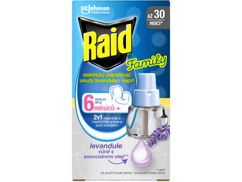 Raid against tantari este un vaporizator electric de rezervă cu insecticid lichid cu lavandă, care oferă protecție eficientă împotriva țânțarilor timp de până la 45 de nopți/8 ore/noapte. Oferă protecție continuă și discretă, fără mirosuri neplăcute sau fum.