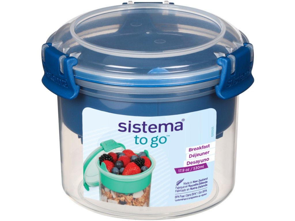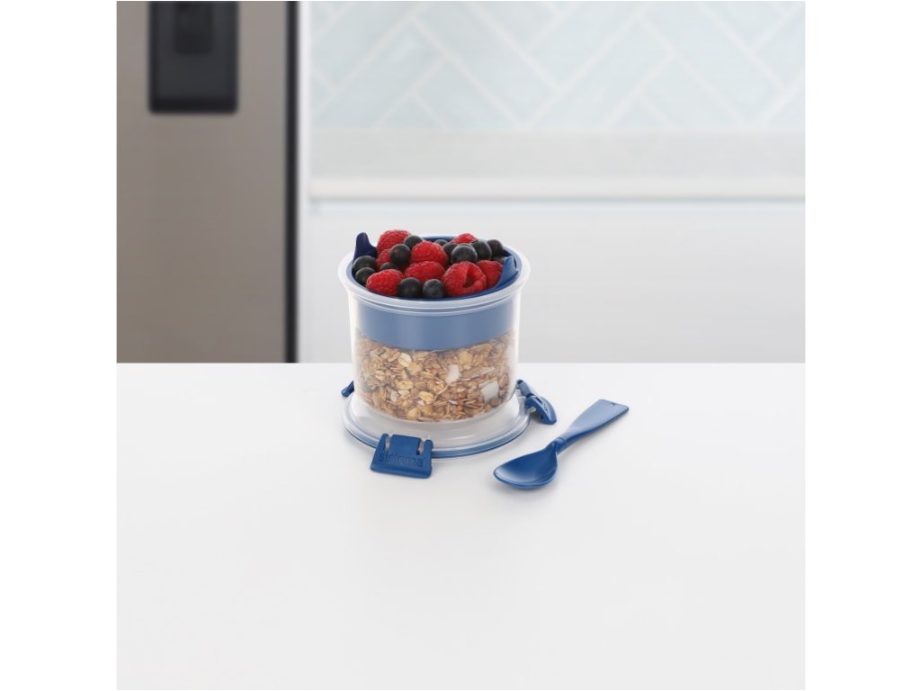 Sistema TO GO 530 ml cu bol și lingură separate în interior este un ajutor inteligent și practic pentru oricine dorește să ia un mic dejun sau o gustare sănătoasă la serviciu, la școală sau în călătorii. Forma practică vă permite să depozitați diferite tipuri de alimente separat și să le amestecați chiar înainte de consum. În partea inferioară puteți depozita, de exemplu, iaurt, în partea superioară orice ingredient potrivit (muesli, fructe, fructe uscate sau cereale). Datorită linguriței incluse, puteți consuma deliciile preferate oriunde. Forma stivuibilă asigură utilizarea maximă a spațiului din cămară, frigider și congelator. Avantaje: • Lingură inclusă • Două compartimente separate • Plastic rezistentParametri suplimentari