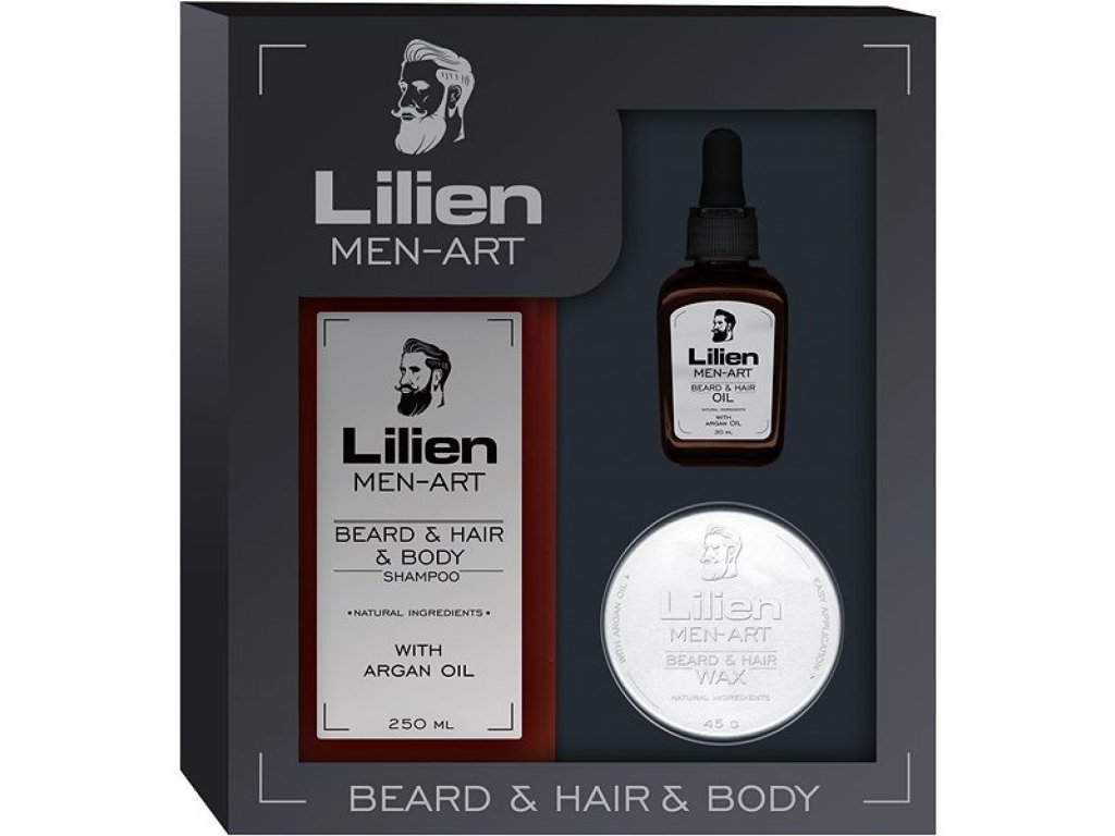 Setul cadou cosmetic pentru bărbați LILIEN Men-Art Black conține trei produse de calitate într-o cutie elegantă. Marca cehă Lilien . Veți găsi un șampon pentru barbă, păr și corp, îmbogățit cu lanolină și fulgi de ovăz coloidali. De asemenea, un ulei pentru barbă și păr fabricat din uleiuri naturale, care conține ulei de ovăz, obținut prin extracția delicată a boabelor de ovăz special rafinate. Trioul de produse este completat de o ceară pentru barbă și păr, care conține ulei de argan presat la rece și ulei de macadamia. Toate produsele din setul cosmetic LILIEN Men-Art Black sunt unite de un parfum masculin, lemnos-picant, cu o notă de prospețime și Orient.