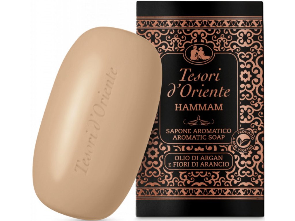 Săpunul de toaletă parfumat Tesori d'Oriente Hammam creează o spumă bogată ce curăță delicat pielea, îi conferă un aspect mătăsos și lasă un minunat parfum oriental. Uleiul de argan, conținut în săpun, este obținut din fructul arborelui de argan (Argania spinosa), care crește în sudul Marocului. Are proprietăți antioxidante, hidratante și nutritive. Este utilizat pe scară largă în cosmetică ca elixir de frumusețe. Potrivit pentru toate tipurile de piele pentru spălarea mâinilor și a feței. Nu conține parabeni, siliconi, uleiuri minerale și coloranți artificiali. Testat dermatologic.