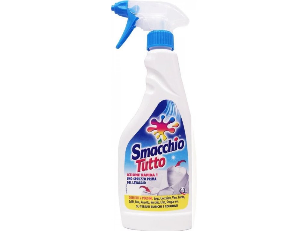 Spray-ul Smacchio Tutto poate îndepărta cu ușurință toate petele de pe hainele și țesăturile albe și colorate înainte de spălare. Datorită spray-ului, aplicarea sa este și mai ușoară și mai rapidă. Pentru țesături delicate (mătase, lână etc.) și haine pastelate, încercați produsul pe o mică zonă ascunsă - de exemplu, pe tiv. Produsul îndepărtează eficient petele de cerneală, bere, vin, ciocolată, cafea, suc, fructe, iarbă, ruj, rimel și fard de pleoape, sânge, mucus etc. Conținut 500 ml. Utilizare: Pulverizați direct pe pată. Lăsați să acționeze câteva minute (max. 5 min.), apoi spălați conform recomandărilor. Nu lăsați produsul să se usuce pe țesătură! În cazul petelor de sânge, clătiți pata cu apă rece înainte de a utiliza produsul.