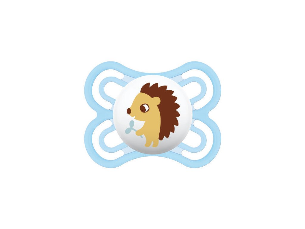 Tetină extra subțire pentru a reduce riscul de dinți strâmbi și malocluzie Suzeta ortodontică MAM Perfect 0+ luni reduce riscul de dinți strâmbi și malocluzie. Datorită tetinei unice Dento-Flex din catifea, gâtul tetinei este cu 60% mai subțire și de patru ori mai moale (în medie, cu 32-83% mai subțire și de 1,1-19 ori mai moale decât suzetele convenționale din silicon). Acest lucru oferă dinților mai mult spațiu pentru a crește și reduce riscul de dinți strâmbi. Cu un diametru de doar 2,8 mm, gâtul tetinei MAM Perfect este cel mai subțire de pe piață (testat de un institut de cercetare din Austria pe 27 de suzete din întreaga lume). 94% dintre bebeluși acceptă tetina din silicon MAM SkinSoft™, care este la fel de moale ca pielea unui bebeluș (studiu de piață 2010-2019, testat pe 1.463 de bebeluși din 6 țări). Suzeta este delicată cu pielea bebelușului datorită orificiilor mari de ventilație din zgarda suzetei, care permit o circulație mai bună a aerului în jurul gurii, ajutând la reducerea iritației pielii cauzate de saliva reținută. Butonul face ca suzeta să fie ușor și rapid de prins și, de asemenea, ușor de atașat la curea. Ambalată într-o cutie practică care menține suzeta curată și servește și ca sterilizator. Toate produsele MAM sunt fabricate din materiale fără BPA și BPS.Parametri suplimentari