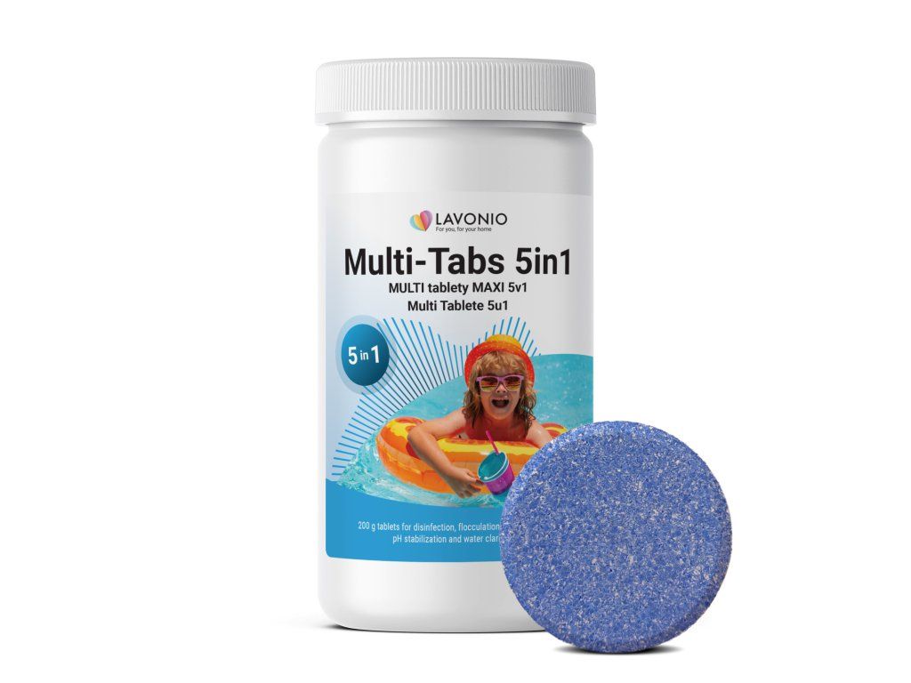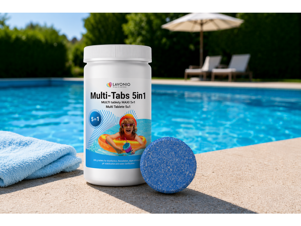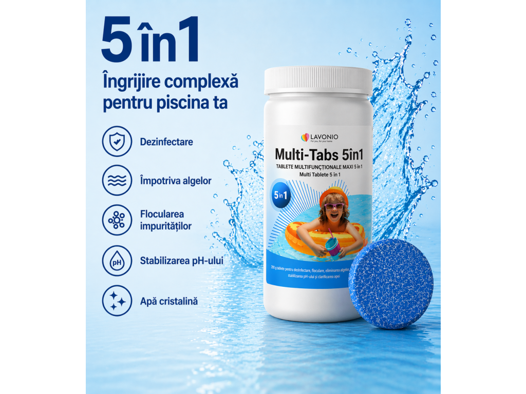 Tabletele multifuncționale 5în1 asigură îngrijirea completă a apei din piscină. Se dizolvă lent în 5–10 zile, fără calciu – nu tulbură apa și nu cresc duritatea acesteia. Potrivite pentru piscine cu folie și plastic până la 30 m³.