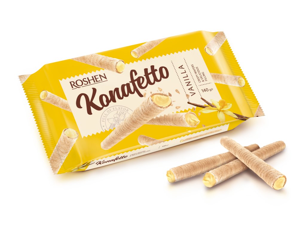 Descoperiți tuburile crocante de napolitane Roshen Konafetto umplute cu cremă delicată de vanilie. Datorită texturii lor ușoare, se topesc literalmente pe limbă și oferă o armonie perfectă între crocant și umplutura cremoasă.