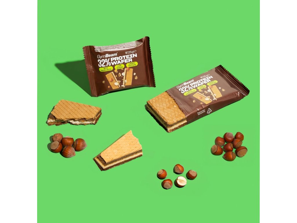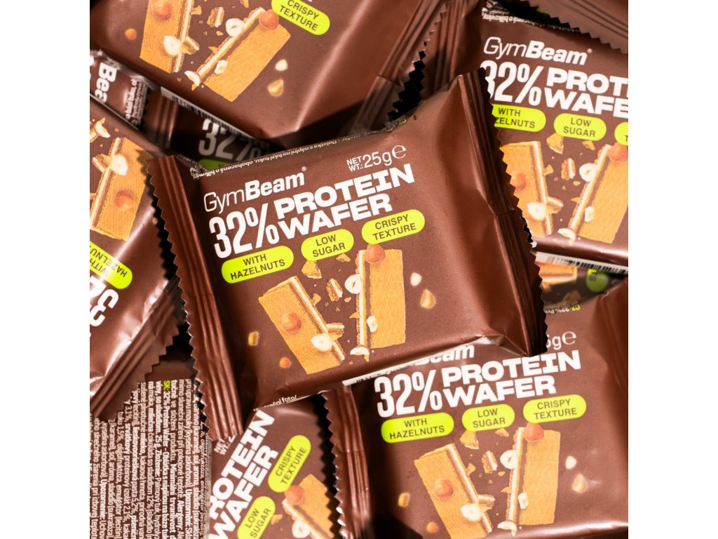 32% napolitană proteică – napolitană proteică cu 3 straturi, cu un gust irezistibil de lapte și nuci, conținut ridicat de proteine și conținut scăzut de zahăr