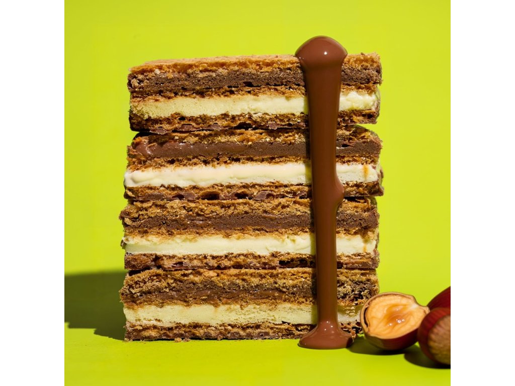 - delicios stratificat, făcut din 3 napolitane, umplutură de lapte și nuci